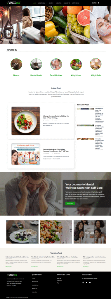 Fitness Bite is a health-focused web design project inspired by active living and smart nutrition. The website showcases content through a fresh, vibrant, and well-structured layout that emphasizes clarity, motivation, and ease of use. The primary objective was to create a strong digital identity that blends modern design with functionality, delivering a smooth user experience while promoting wellness, energy, and a healthier lifestyle.